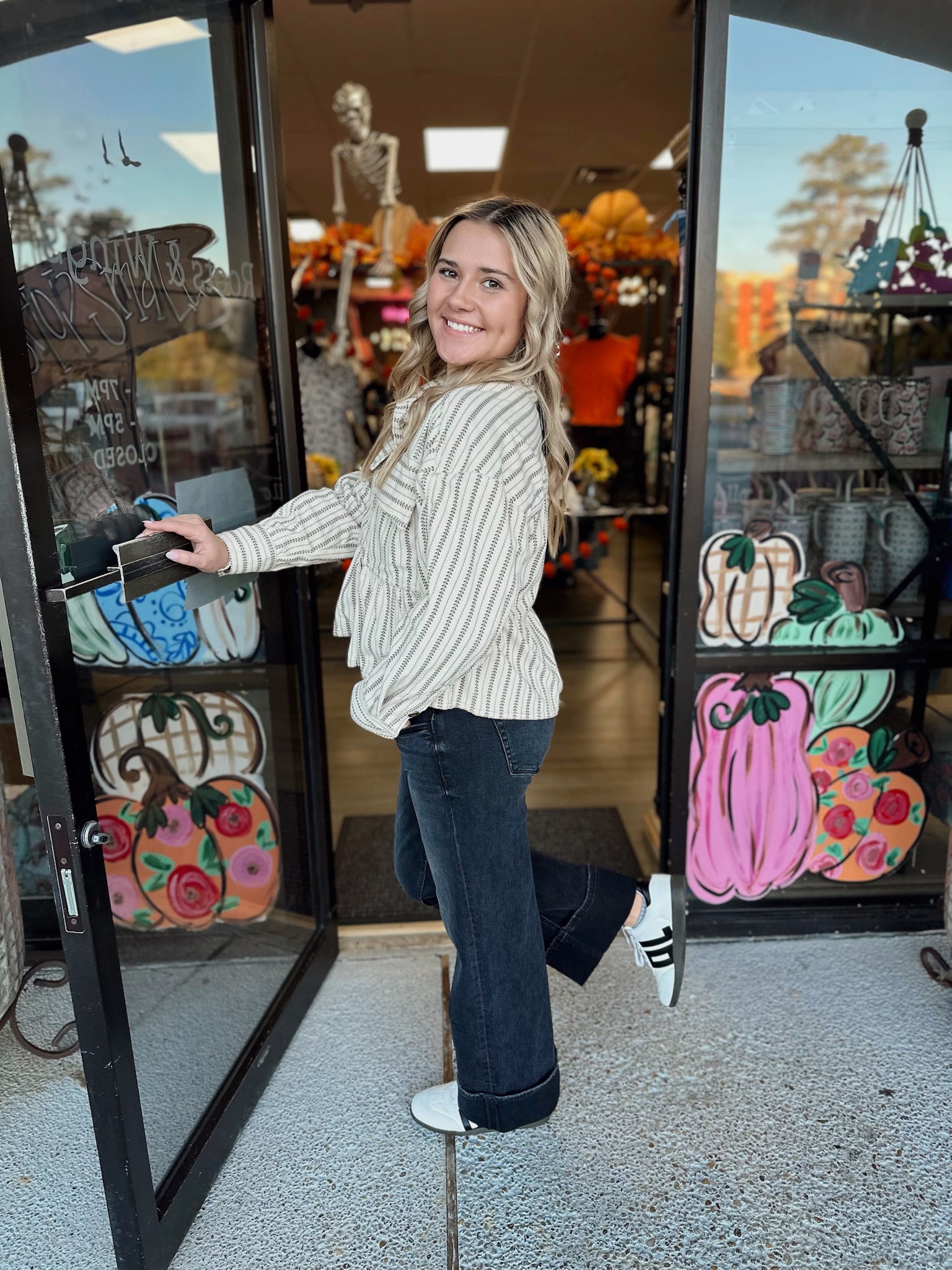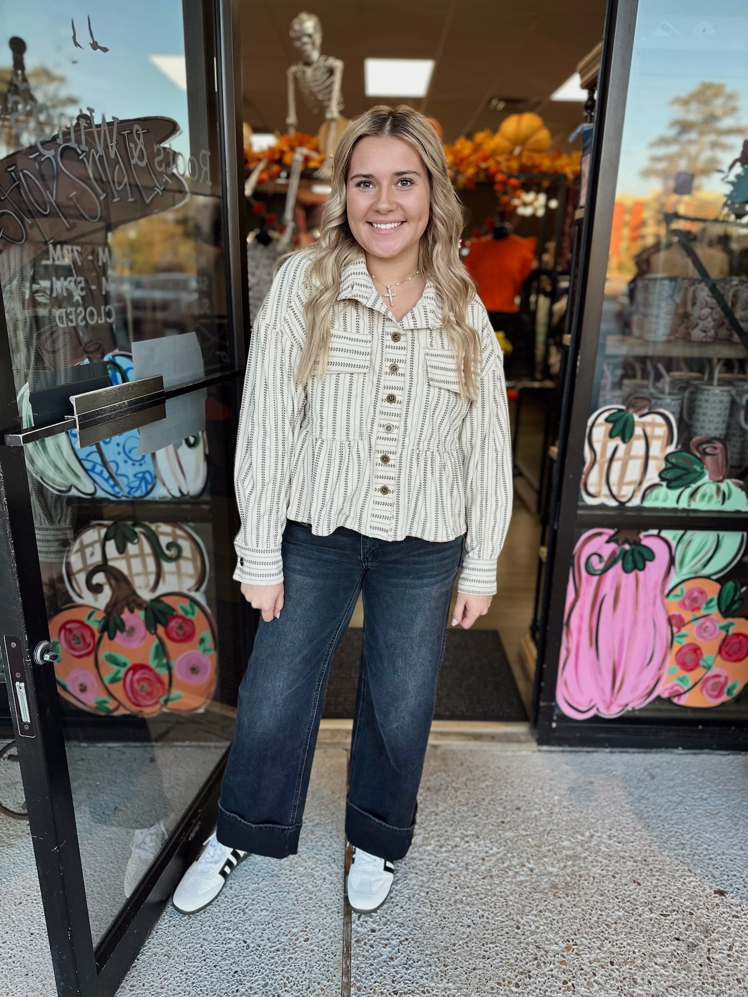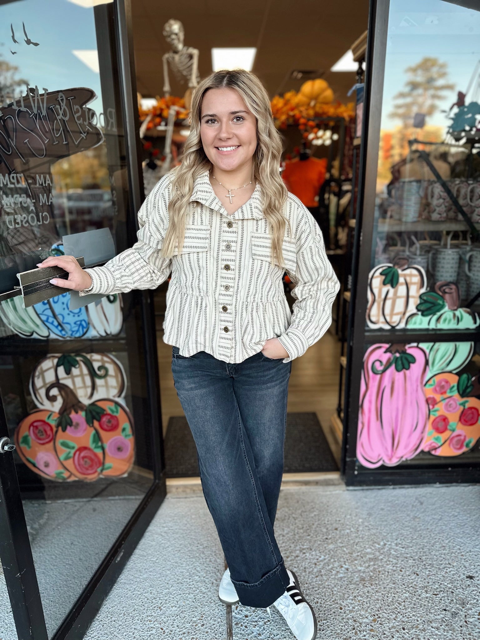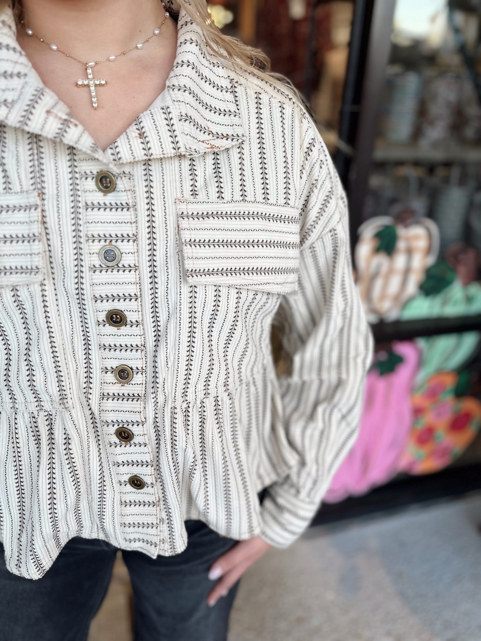Printed Corduroy Babydoll Style Button Up Jacket with a Mock Neck