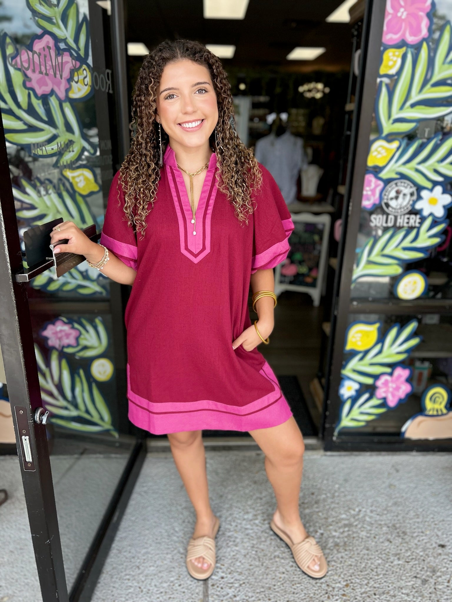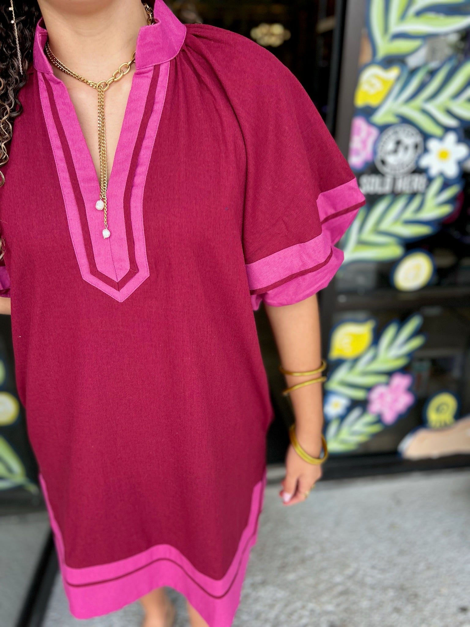 Solid contrast accented short lantern sleeves pullover mini dress with slit hem featuring a high neck split collar band. Lined. Woven. Non-sheer Midweight.